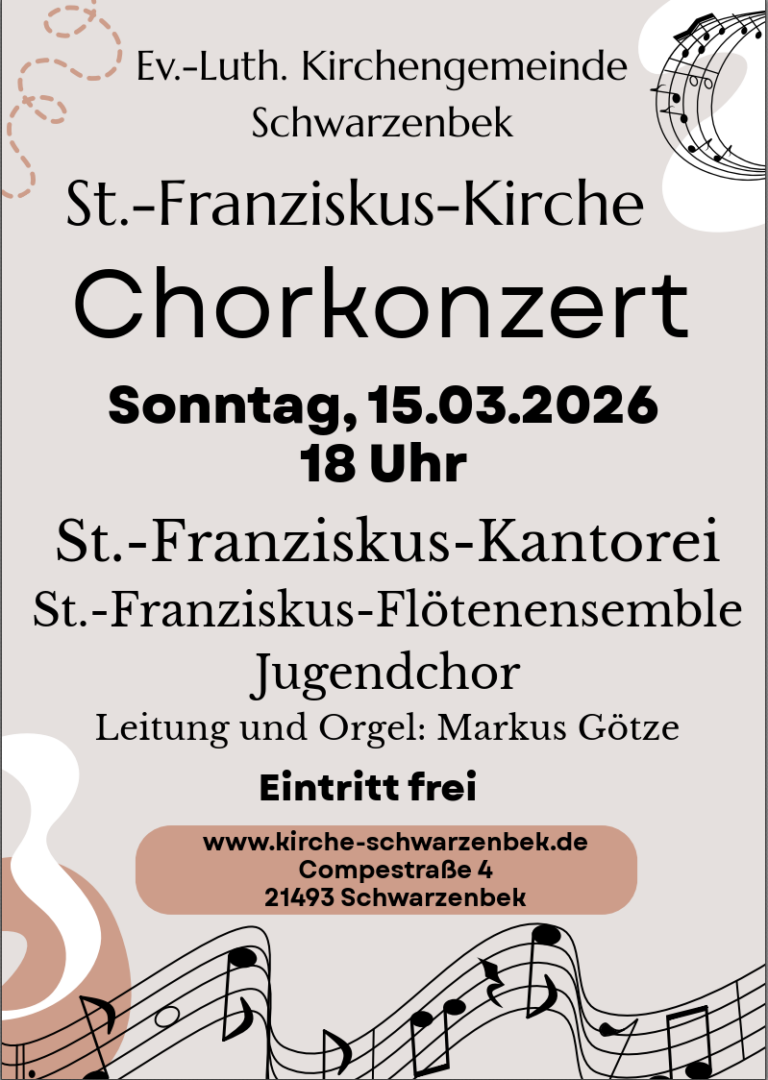 Schwarzenbek – Die St.-Franziskus-Kantorei Schwarzenbek, St.-Franziskus-Flötenensemble und Jugendchor, Leitung und mit der Orgel Markus Götze, am Sonntag, 15. März, 18 Uhr, in der St.-Franziskus-Kirche, Compestraße 4, 21493 Schwarzenbek. Ein klangvoller Frühlingsauftakt erwartet die Musikfreunde in Schwarzenbek: Die St.-Franziskus-Kantorei, das St.-Franziskus-Flötenensemble und der Jugendchor Schwarzenbek laden zu einem gemeinsamen Chorkonzert in die St.-Franziskus-Kirche ein. Das Publikum darf sich auf ein ebenso abwechslungsreiches wie stimmungsvolles Programm freuen. Die Leitung hat Markus Götze. Auf dem Programm stehen unter anderem Werke des schleswig-holsteinischen Komponisten Dieter Golombek. Die Werke dieses Komponisten verbinden eingängige Melodien mit leichtem, beweglichem Klang und zeigen, wie lebendig zeitgenössische Kirchenmusik aus der Region klingen kann. Romantische Motetten von Arnold Mendelssohn und Christian Heinrich Rinck sind weitere Elemente des Programms. Die Musik der Romantik zeichnet sich vor allem durch besonders schöne Harmonik aus. Die Kompositionen entfalten mit warmen Klangfarben und inniger Ausdruckskraft eine besondere Atmosphäre – Musik, die Herz und Raum gleichermaßen erfüllt. Auch Freunde eingängiger Segenslieder kommen auf ihre Kosten. Mal zart und meditativ, mal kraftvoll und getragen laden sie zum inneren Mitschwingen ein. Für frische Akzente sorgen darüber hinaus Kompositionen des Schwarzenbeker Kantors Markus Götze, der die Chöre leitet und an diesem Abend alle musikalischen Fäden in der Hand hält. Seine Werke schlagen eine Brücke zwischen Tradition und Gegenwart – stets mit eigener Handschrift. Ein weiteres Highlight ist der Jugendchor Schwarzenbek. Mit Auszügen aus der Welt des Musicals bringt er jugendliche Energie und rhythmischen Schwung in das Konzert. Darüber hinaus wirken die jungen Sängerinnen und Sänger auch im großen Chor mit – ein klangvolles Miteinander der Generationen, das eindrucksvoll zeigt, wie lebendig kirchliche Musikarbeit in Schwarzenbek ist. Das St.-Franziskus-Flötenensemble wird in diesem Jahr sein 25-jähriges Jubiläum feiern und wird schon in diesem Konzert einige Kostbarkeiten der Flötenmusik präsentieren. Die Veranstaltung dauert etwa eine Stunde. Die Konzertbesucher werden auch zum Mitsingen eingeladen. Der Eintritt ist frei.