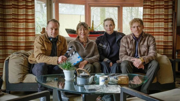 Zum Bild: Beliebte TV-Krimiserie „Nord bei Nordwest“: Die Darsteller Hinnerk Schönemann (v. l.), Gitta Schweighöfer, Jana Klinge, und Pit Bukowski haben sich zum Drehstart der neuen Folge „Blindgänger“ am Set versammelt. Die Premiere des Films wird beim Freiluftkino im Kurpark Ratzeburg gezeigt. Foto: NDR/Gordon A. Timpen
