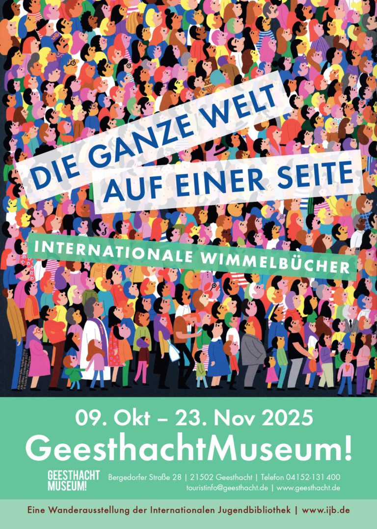 Geestahacht – Die Wanderausstellung der Internationalen Jugendbibliothek in München (www.ijb.de) ist noch bis zum 23. November im GeesthachtMuseum! zu sehen und richtet sich an die ganze Familie. Zu sehen sein wird eine Zusammenstellung von internationalen Wimmelbildern aus den letzten 20 Jahren. In Wimmelbüchern ist ganz schön was los, denn auf jeder Seite gibt es tausend Dinge zu entdecken und viele Geschichten warten darauf, erzählt zu werden. Oft zeigen die Zeichnungen Alltagsszenen im Tages- und Jahreslauf, Kinderzimmer, das Innenleben von Häusern oder Städte. Oft nehmen sie dabei auch auf reale Orte und Räume Bezug. Ohne (viele) Worte erzählen Wimmelbücher von der „ganzen Welt“ und regen zum Entdecken an.